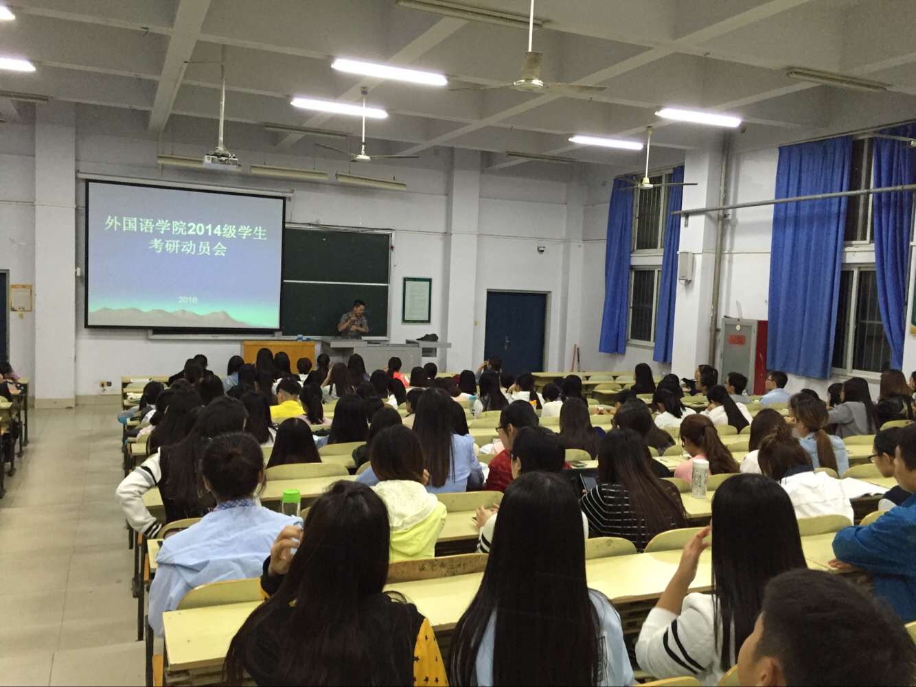 9月28日晚上7点,我院在B合四多媒体教室举行了2014级英语专业考研座谈会。我院英语教师温军超(语言学方向)、彭晓燕(英美文学方向)、张艳玲(教育学方向)、樊晓云(商务方向)、马文慧(口笔译方向)与2014级准备考研的120多名同学积极参加了此次动员会。
