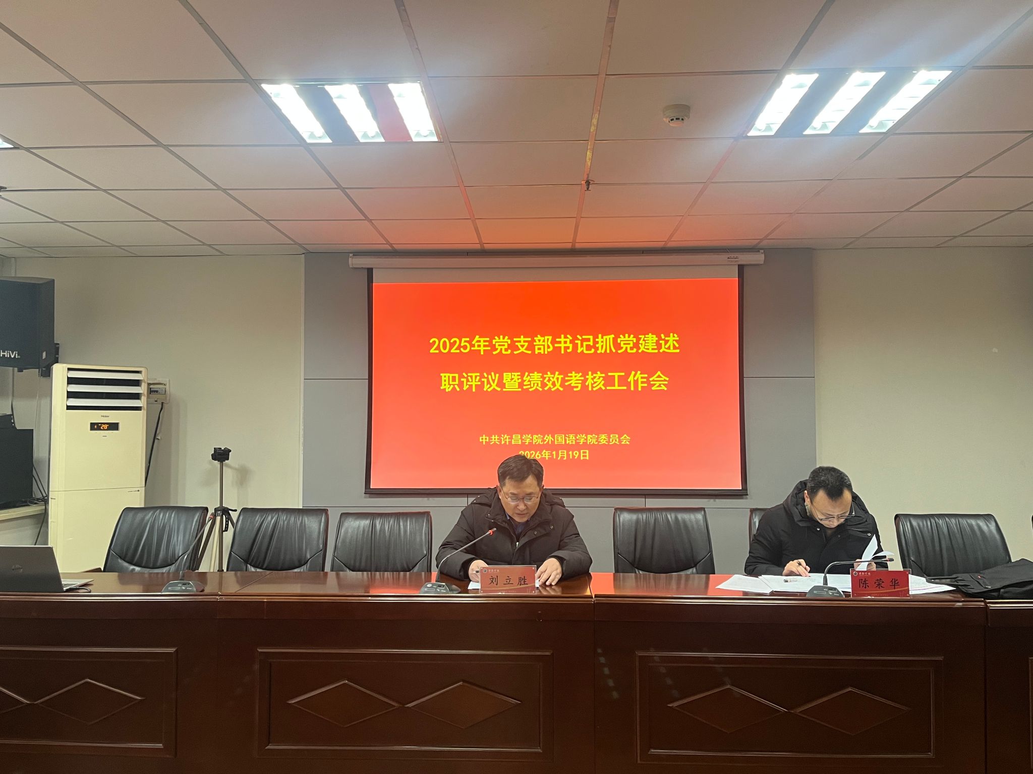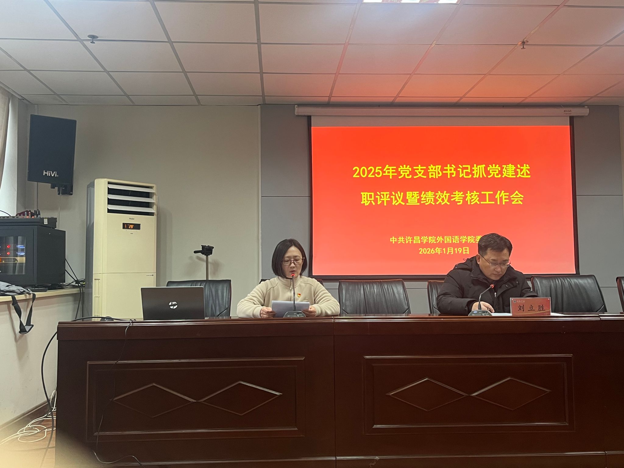为夯实基层党建工作基础,压紧压实党支部书记抓党建政治责任,推动全面从严治党向基层延伸,2026年1月19日上午,外国语学院党委在文综楼1917会议室召开2025年度党支部书记抓党建述职评议暨绩效考核工作会。我院党委书记刘立胜主持会议,学院班子成员、党委委员、各支部书记、支部委员及师生党员代表共23人参加,教育学院党委副书记陈荣华到会督导。