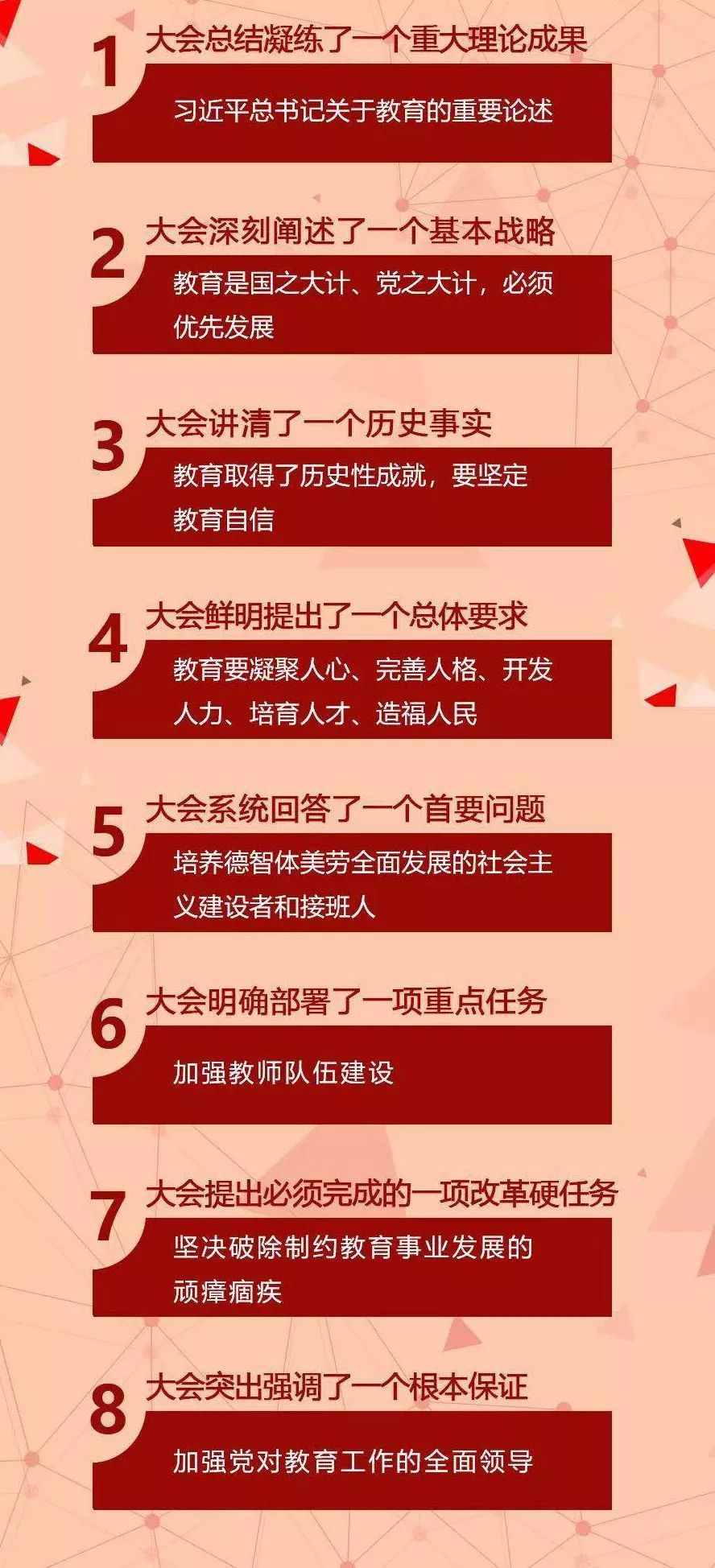 六是大会明确部署了一项重点任务,即加强教师队伍建设。深刻阐述了教师的重要地位和作用,充分肯定教师的重大贡献,深刻分析当前教师队伍建设面临的形势,对教师、教育和有关部门、全党全社会提出明确要求。