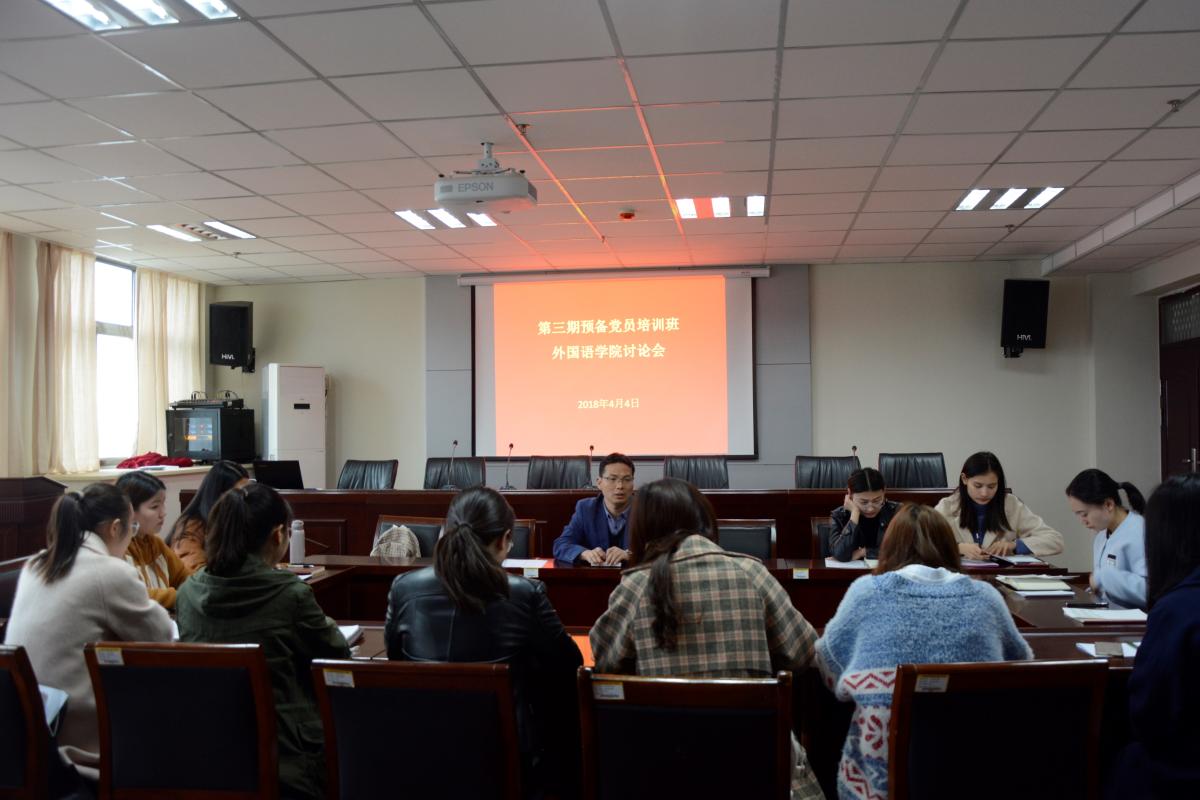 4月4日,外国语学院第三期预备党员培训讨论会在文科综合楼1917、1920举行。外国语学院学生党支部陈化宇、牛怡晨、李佳琪老师主持讨论,参加此次会议的是第三期全体预备党员。