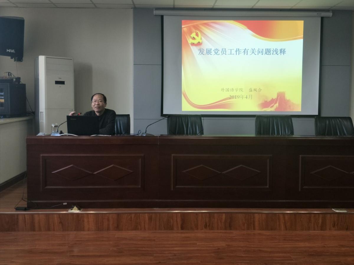 4月17日下午六点,外国语学院于文综楼1917开展了以“发展党员工作有关问题浅释”为主题的入党积极分子培训课。此次党课,由党总支书记盛双合讲解了发展党员工作的依据和要求,在发展党员工作中,要按照控制总量、优化结构、提高质量、发挥作用的总要求,坚持党章规定的党员标准,坚持慎重发展,有计划地进行。