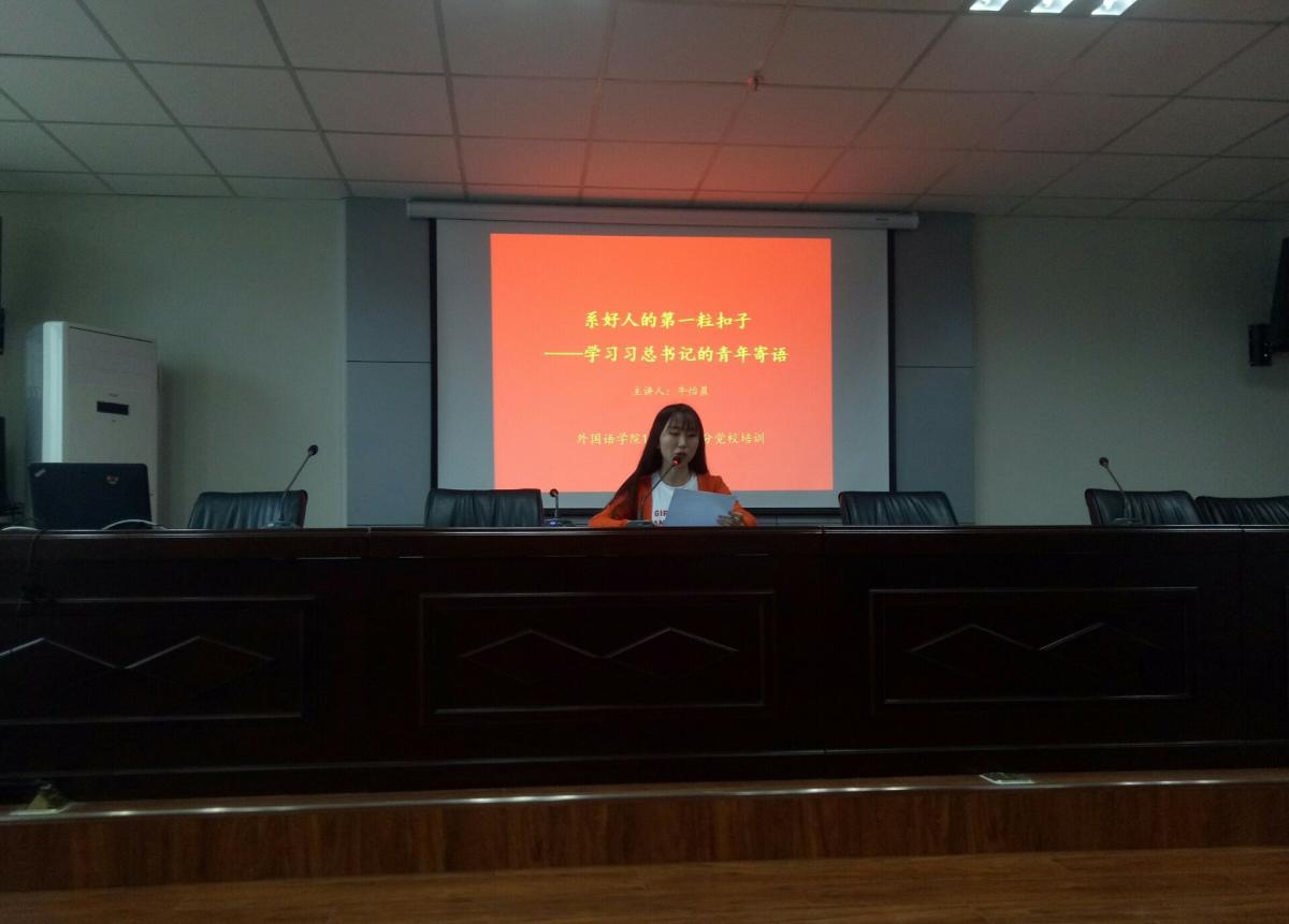 4月25日下午六点,外国语学院于文综楼1917召开以“系好人的第一颗扣子――学习习近平总书记的青年寄语”为主题的入党积极分子培训课。此次党课,由牛怡晨老师主讲,学习习近平总书记对青年提出的要求。“把学习作为首要任务”、“忌讳心浮气躁,朝三暮四”、“少年强则国家强”、“同大众方阵保持一致”、“青年人要树立远大的理想”等一系列优秀精神。