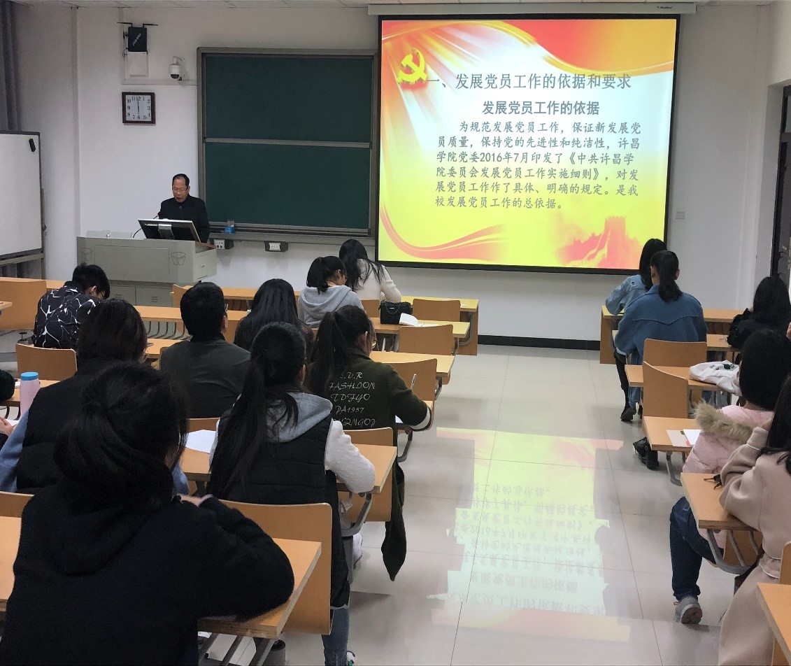 11月6日下午,在文综楼204教室,外国语学院党总支副书记盛双合以“发展党员工作有关问题浅析”为主题为18191期入党积极分子上党课。盛双合书记依据许昌学院党委于2016年7月印发的《中共许昌学院委员会发展党员工作实施细则》,讲述发展党员工作的依据和要求以及对发展学生党员的具体要求进行了详细地阐述最后从申请入党到成为一名正式的共产党员,要不断地进行思想教育,端正态度,脚踏实地,积极靠近党组织,努力成为强国一代,成为一名合格的社会主义建设者和接班人。