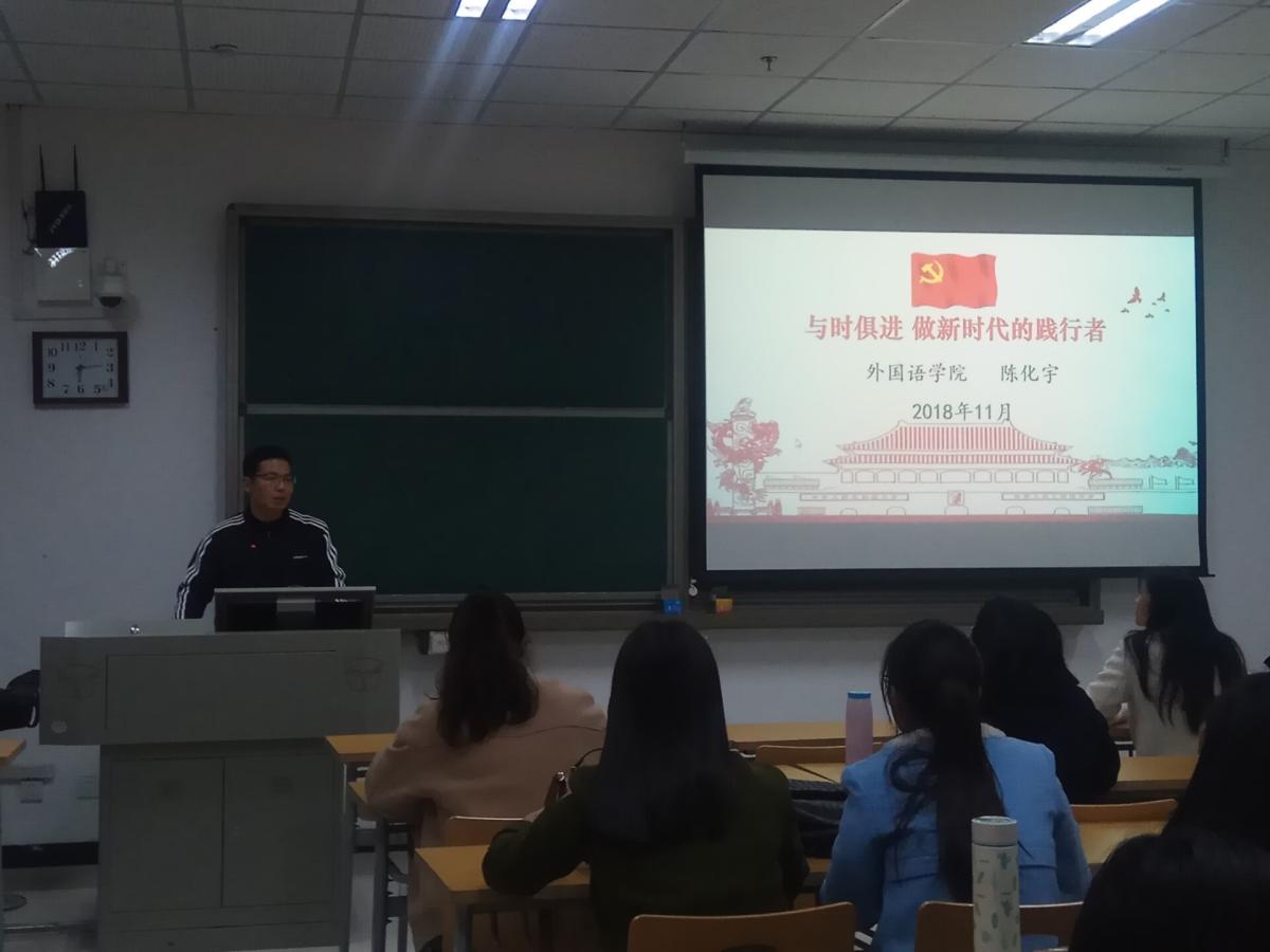 11月7日,在文综楼602教室,陈化宇老师以“与时俱进、做新时代的践行者”为主题为入党积极分子上党课。首先,陈老师讲述了习近平总书记在各个高校的重要讲话精神,以中国科学院大学、中南大学等讲话为例呼吁在校大学生应珍惜青春年华、脚踏实地,勤学本领、做新时代的实践者,立志报效祖国、服务人民。其次,他谈到了习近平总书记对大学办学的要求和对当代青年的希望,即大学办学要坚持办学正确政治方向、建设高素质教师团队、形成高水平人才培养体系。最后,陈老师讲到了教育部党组书记陈宝生的《新时代全国高等学校本科教育会议》讲话。即要深入学习贯彻习近平新时代中国特色社会主义思想和党的十九大精神,全面贯彻落实习近平总书记的五•二北大讲话精神,大学本科教育应当坚持“以本为本”、“以人为本”推进四个回归,加快建设高水平本科教育,全面提高人才培养能力,造就堪当民族复兴大业的时代新人。