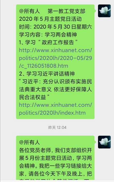我院于5月30日开展了以“学习2020年两会精神”为主题的党日活动。由于疫情防控等原因,此次主题党日活动以QQ在线形式开展。各支部全体党员参加活动。