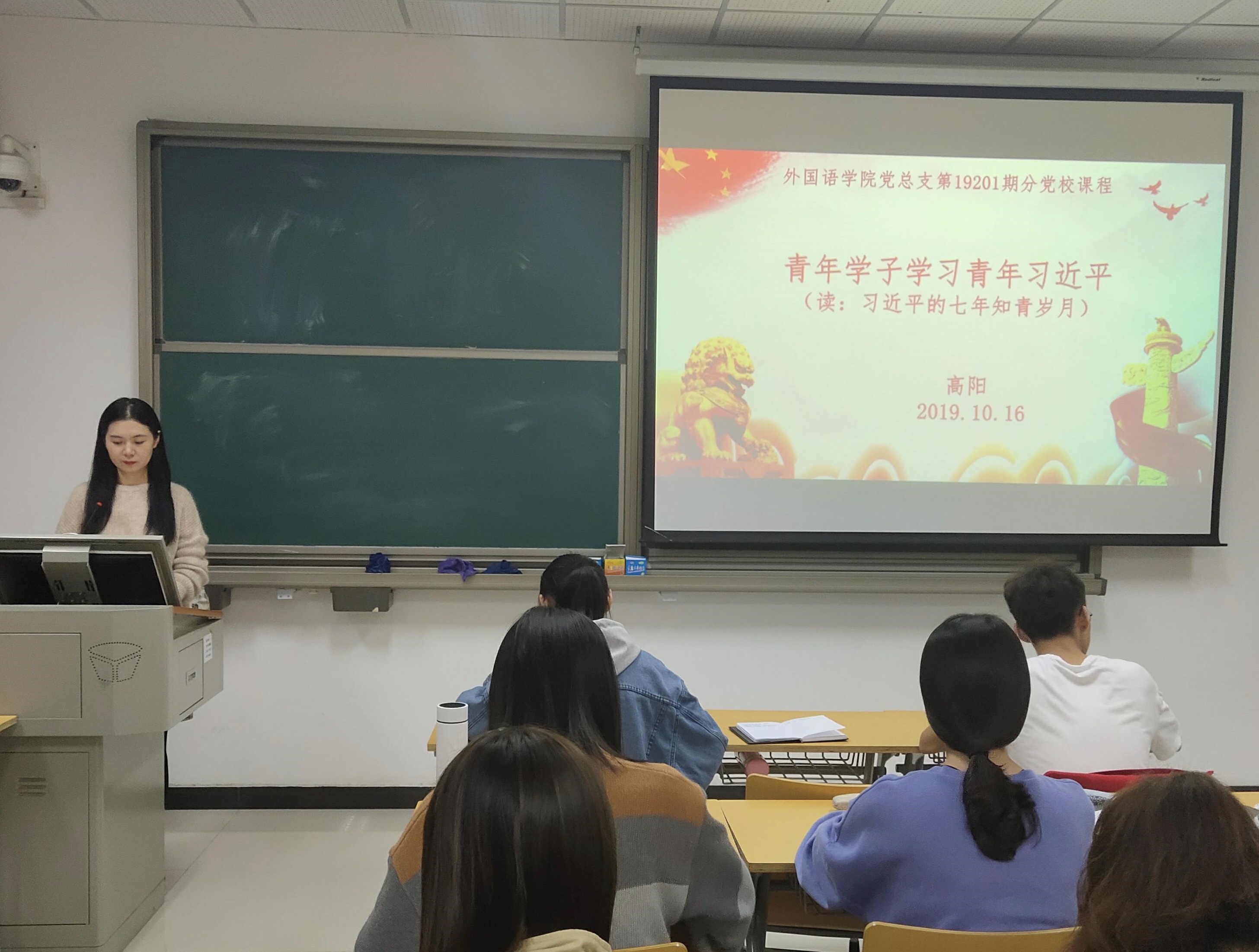 2019年10月16日下午,外国语学院在文综楼416开展了“深入学习贯彻习近平新时代中国特色社会主义思想”为主题的入党积极分子培训课,讲解人是高阳。高老师带领积极分子仔细评读了《习近平的七年知青岁月》,共同回顾党光荣的艰辛岁月,鞭策同学们努力学习奋斗。积极分子同学们纷纷表示,更加了解大学阶段如何成为一名党员,如何树立踏实肯干的工作作风,进一步增强了振兴祖国的责任感和使命感。