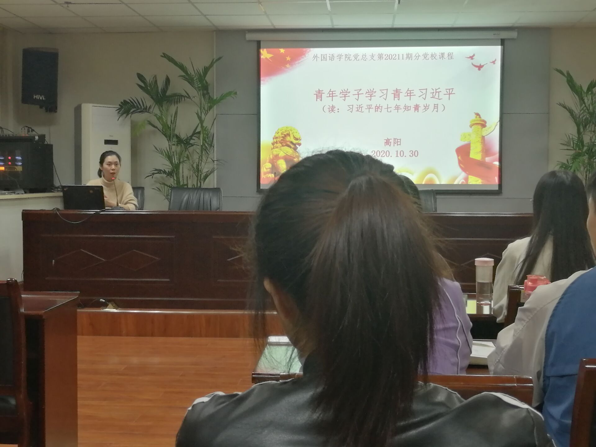 10月30日,外国语学院于文综楼1917开展了以“青年学子学习青年习近平,重读《习近平的学习关于七年知青岁月》”为主题的入党积极分子培训课。本次党课由高阳老师结合习近平总书记的青年时代勉励全体积极分子锐意进取,不断发展,并建议同学们养成读书的好习惯,读万卷书,行万里路。