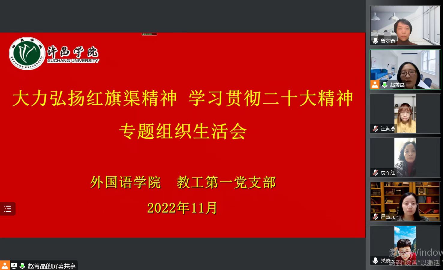 11月26日,教工第一党支部开展“学习贯彻党的二十大精神、大力弘扬红旗渠精神”专题组织生活会,将学习党的二十大精神与学习贯彻习近平总书记视察安阳重要讲话精神紧密结合起来,明确努力方向,把党的二十大精神转化为担当作为、矢志奋斗的精气神。支部书记曾尔奇说,党的二十大擘画了新时代新征程的宏伟蓝图,全面建设社会主义现代化国家任重道远,必须准备付出更为艰巨、更为艰苦的努力。我们要以时不我待只争朝夕的精神投入工作,锻造坚韧不拔、奋发图强的坚强意志,用当年修建红旗渠的拼劲干劲,为创造美好生活一往无前、永不懈怠。