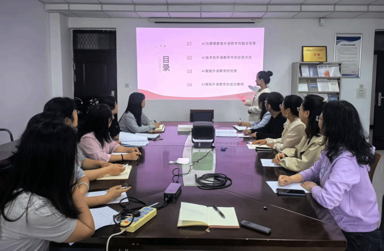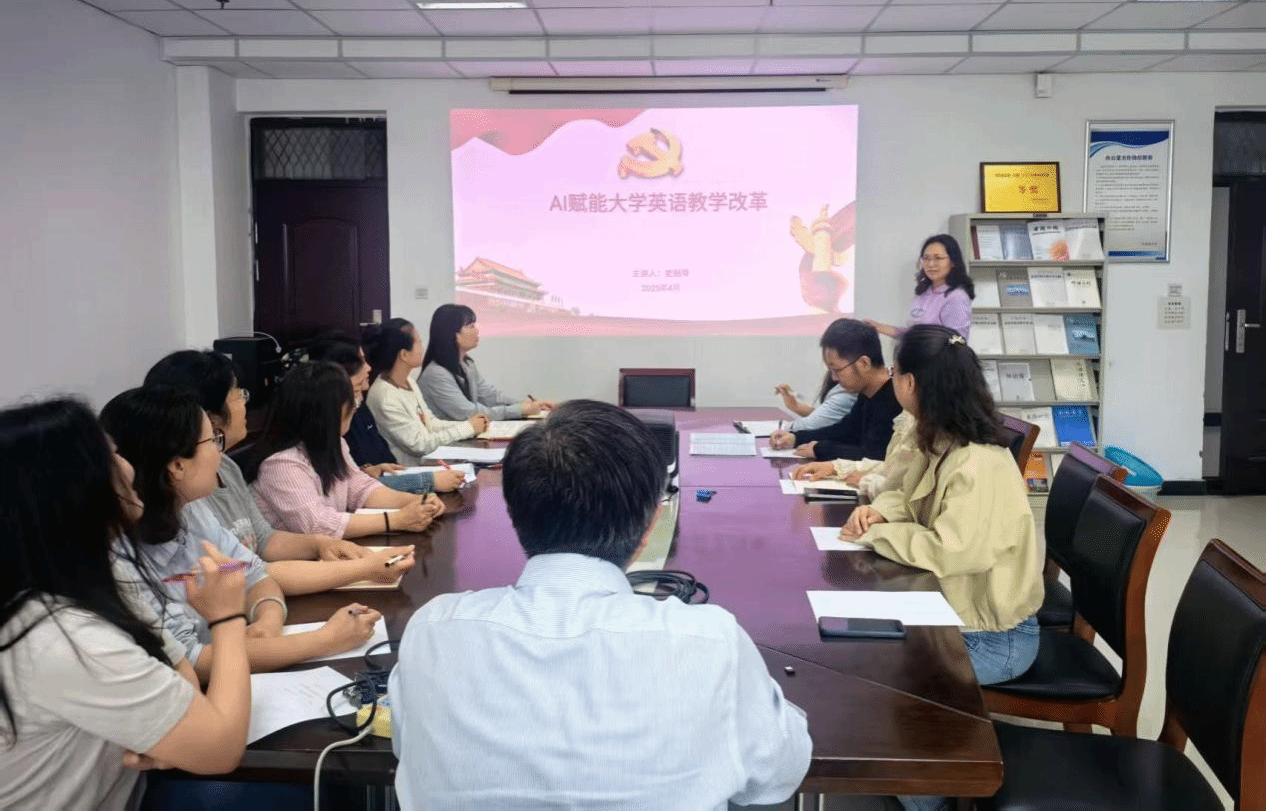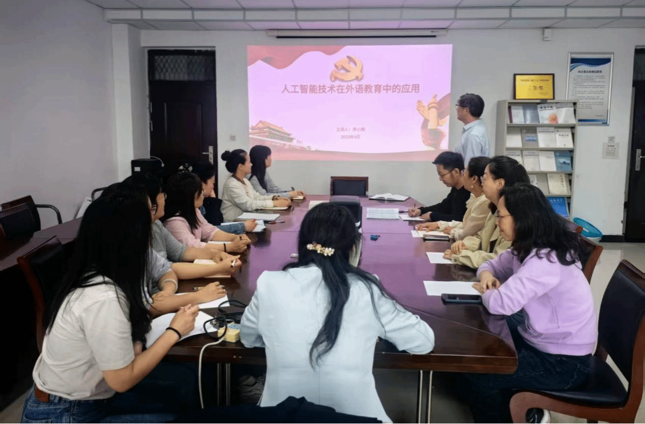 活动第二个阶段:开展 “AI助力高校外语教学改革”论坛,推动党建工作与中心工作双融入、双促进。在论坛阶段,支部特别邀请了李小辉和史丽萍两位“河南省教学标兵”, 以及荣获全国高校外语教学大赛河南省特等奖的刘芳老师,来分享AI 助力高校外语教学改革的实践心得。