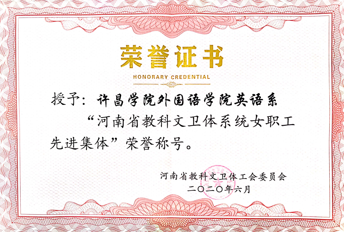 近日,河南省教科文卫体工会下发了《关于表彰2019年度河南省教科文卫体系统女职工先进集体和先进个人的决定》(豫教科文卫体工 〔2020〕19号),我院英语系被授予2019年度河南省教科文卫体系统女职工先进集体荣誉称号。
