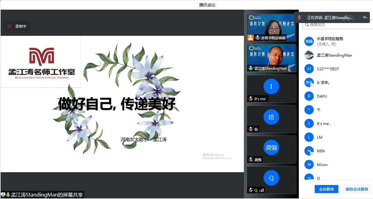 2022年4月9日,外国语学院邀请河南省名师、全国十佳小学英语教师,河南农大附小孟江涛老师为付店镇中心小学全体教师作了题为《做好自己,传递美好》的线上讲座。