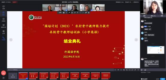 6月16日,“国培计划(2021)”——农村骨干教师能力提升——县级骨干教师培训圆满结束,结业典礼以线上方式举行。我院党总支副书记陈化宇、副院长刘立胜出席活动,国培管理团队及50名参训学员参加了结业典礼。结业典礼由国培导师魏春燕老师主持。