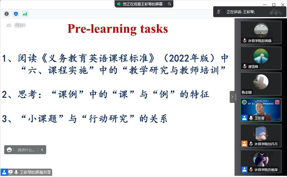 2022年12月26日,外国语学院邀请河南师范大学王彩琴教授为“国培计划(2022)”市级、县级骨干教师(小学英语)培训班学员开展以“聚焦课例,开展反映真问题的小课题研究”为主题的讲座。王彩琴教授为教育部“国培计划”专家库成员,教育部专业学位“教育硕士教育”文科组专家,首届河南省基础教育教学指导委员会外语教学指导专委会副主任,教育部专业学位教育硕士教育文科组专家。