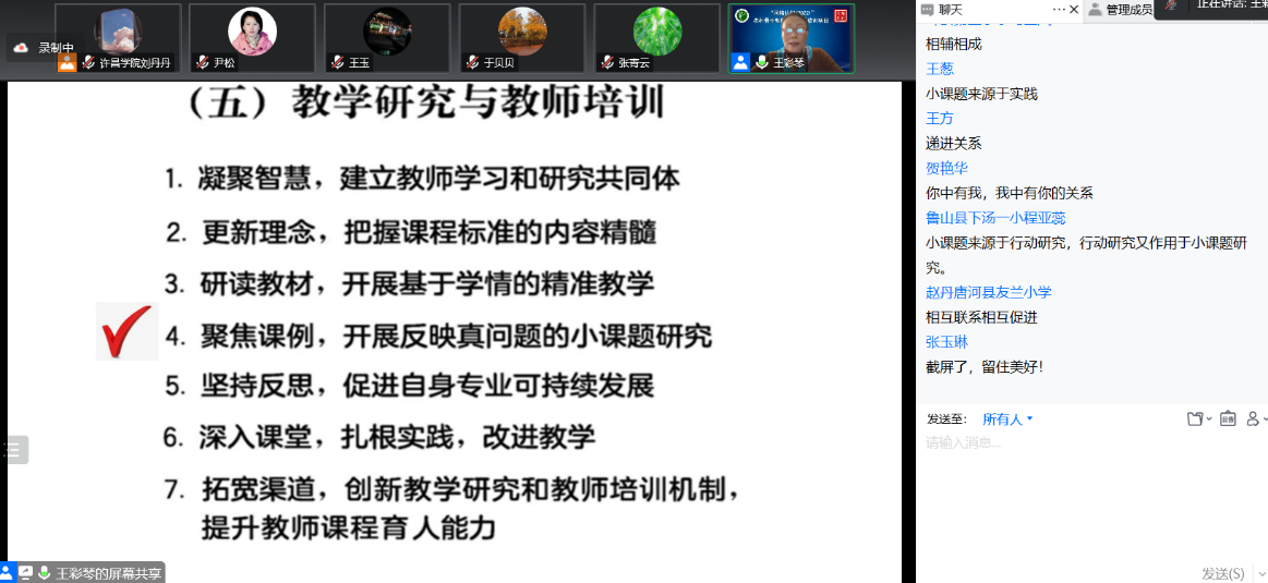 通过王教授的讲解,学员老师们明白了一线教师开展小课题研究要基于研读教材、分析学情,用日常教学的真实情景、设计学生喜爱参与的学习活动,重构英语课程价值观。讲座过程中,学员老师们与王彩琴教授积极互动,纷纷表示王教授的讲座充满教育智慧,值得反复深入学习与研究。(图片提供:刘丹丹)