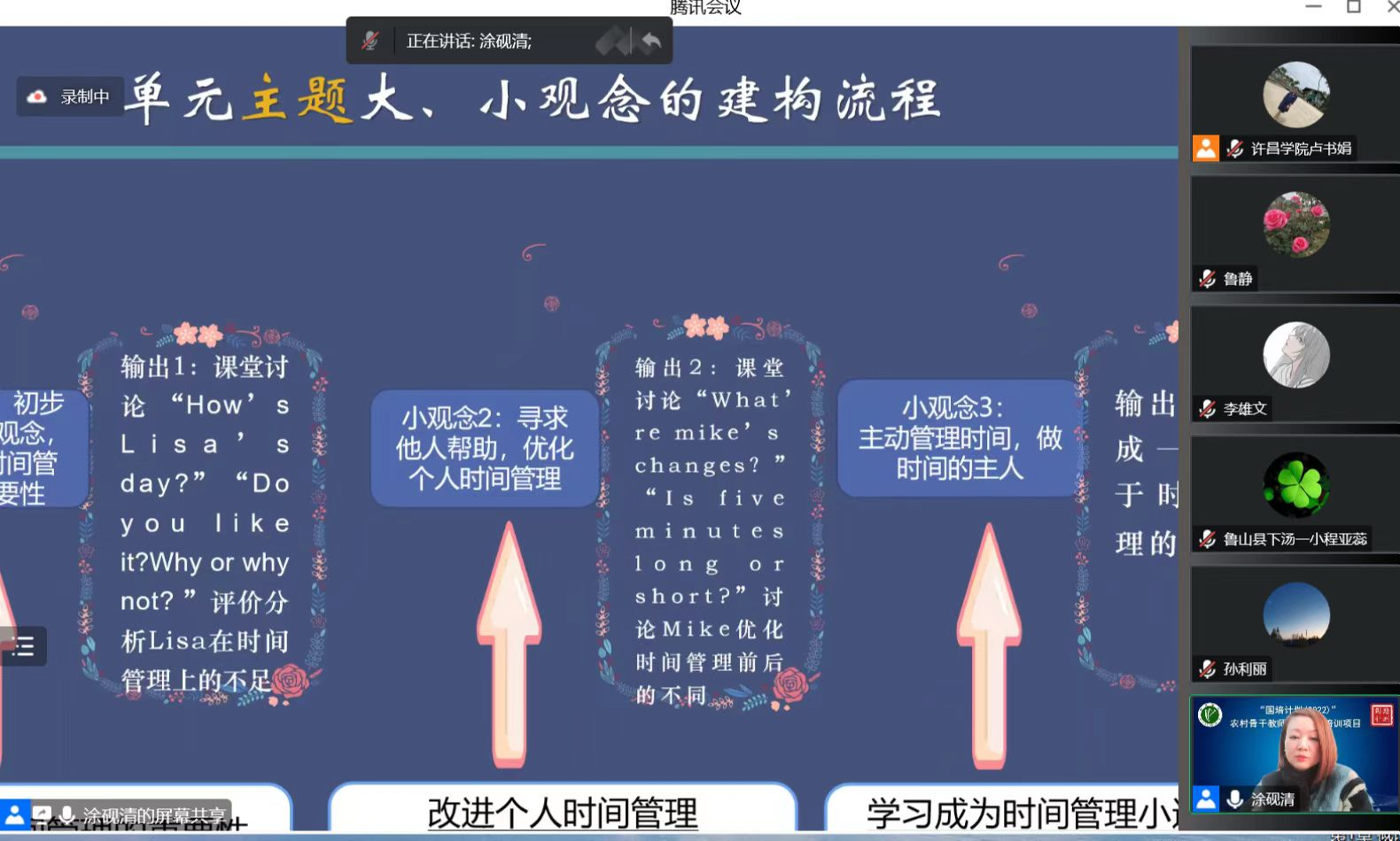 涂砚清老师首先通过案例分析了学员教学设计中存在具体问题,如教学设计缺少逻辑连贯性、教学目标不够科学、教学内容碎片化、教学评价形式化等问题;并详细介绍了什么是英语课程的核心理念、如何基于新课标进行大单元教学设计及What time is it?案例的分享。