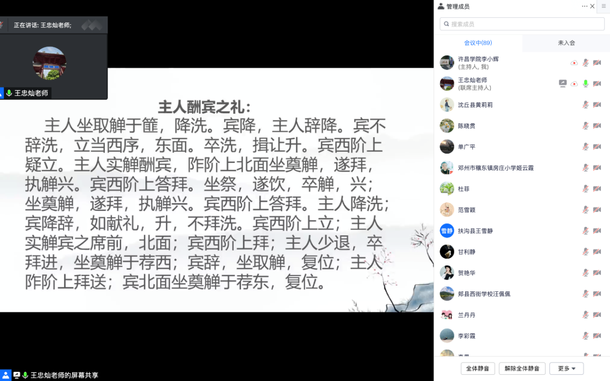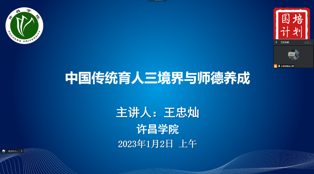 1月2日上午,许昌学院法学院副院长王忠灿博士以《德训、德教、德化:中国传统育人三境界与师德养成》为题,为我院国培学员作了一场精彩的讲座。国培学员相聚腾讯会议,共同聆听了讲座。