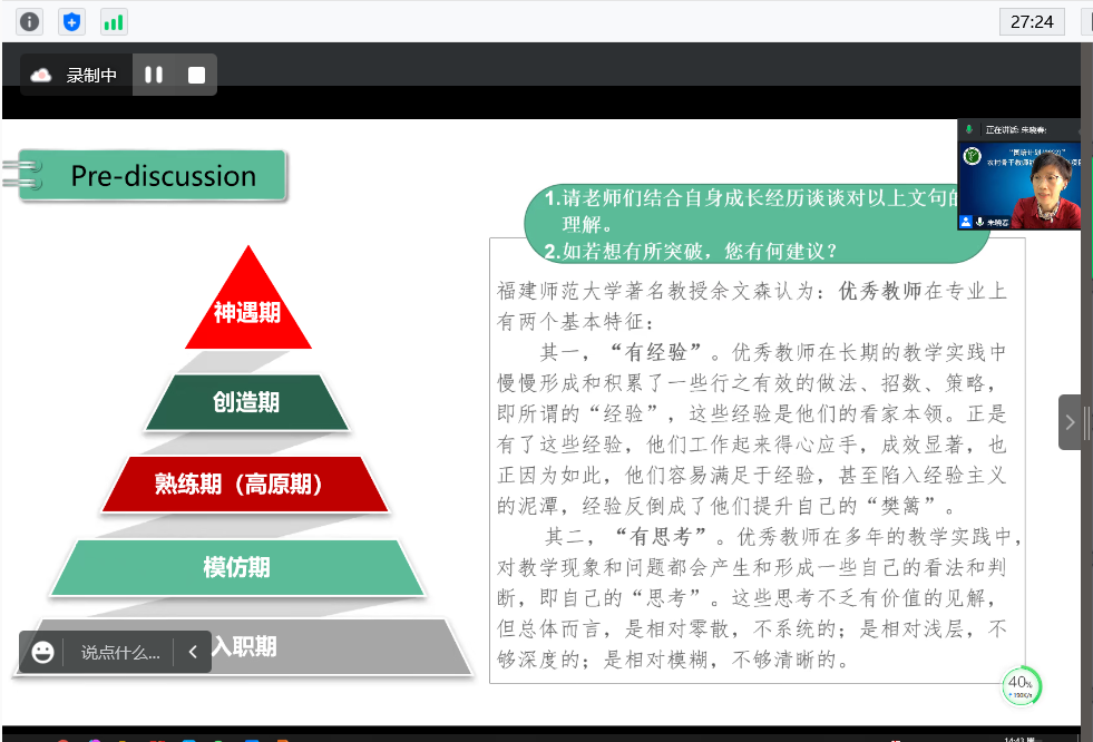 朱晓春老师首先引导学员老师们思考各自的教学困惑和焦虑,思考如何突破现有教育理念、专业认知和教学方法与手段,并指出在只有在科研的引领下,以小课题研究为起点和抓手,才能够更好突破自身的瓶颈,从优秀的状态走向卓越。