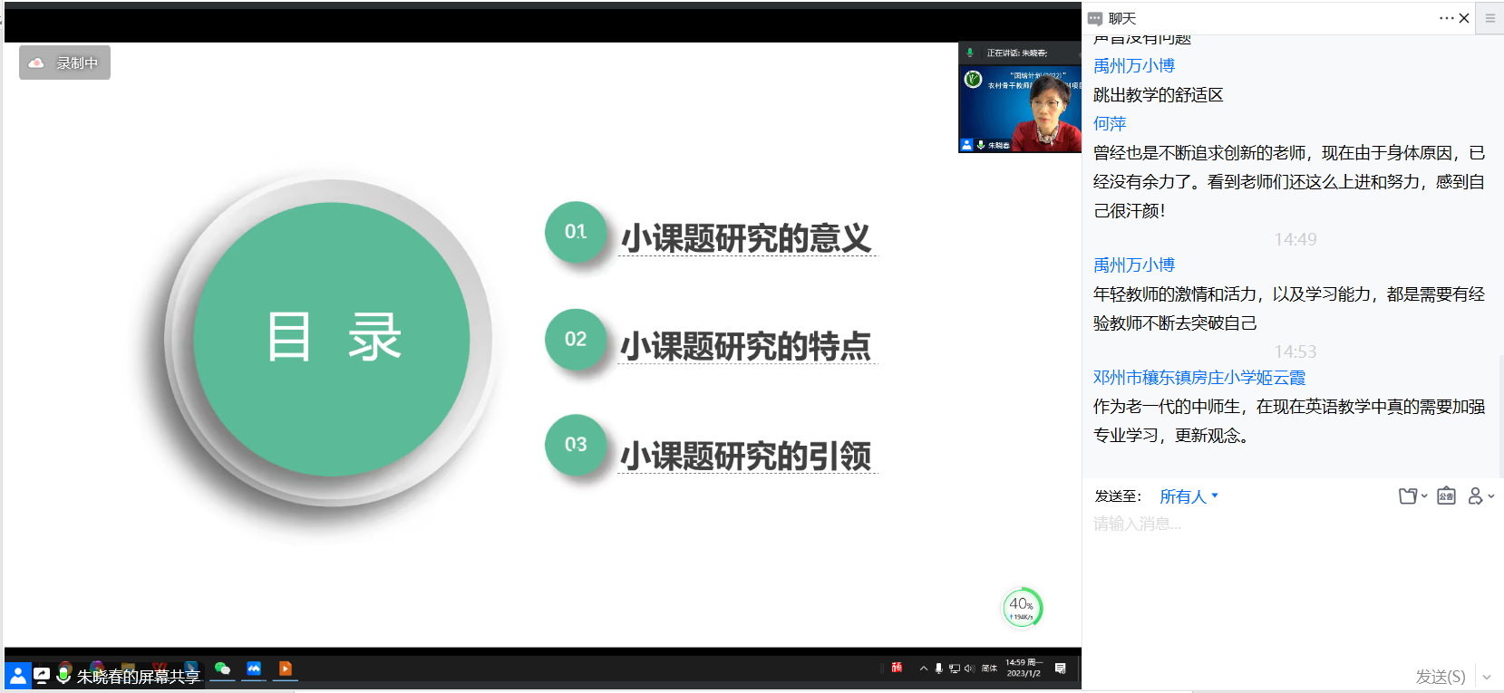 2023年1月2日下午,外国语学院邀请郑州市金水区柳林中心学校朱晓春老师为我院“国培计划(2022)”县级骨干教师培训班学员作了以“小课题研究为教师专业成长插上腾飞的翅膀”为主题的讲座。