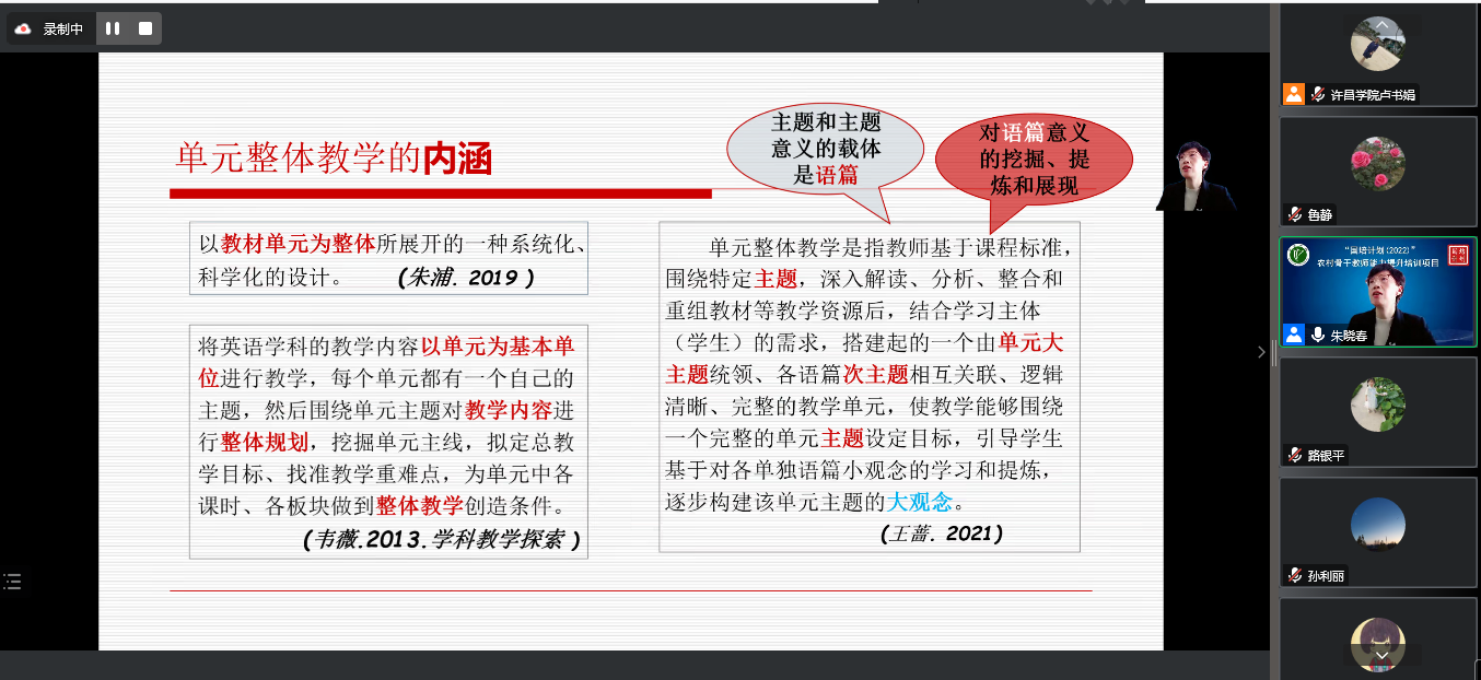 朱老师以“基于主题意义探究的单元整体教学设计”为题,对单元整体教学的内涵、意义和实施路径进行了深入地解读,并依托PEP五年级英语教材Unit 4 I have a pen pal为具体案例,手把手地教授单元整体教学设计的具体操作方法。