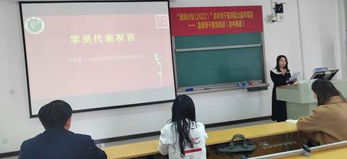 优秀学员代表卫冰格老师代表国培学员进行发言,她对负责本次国培培训的管理团队老师、作讲座的各位专家教授及一线老师表示感谢,并表示以后将把自己在培训期间所学的知识与理念还回本校,充分发挥骨干教师的引领作用,促进本单位教学水平的整体提升。