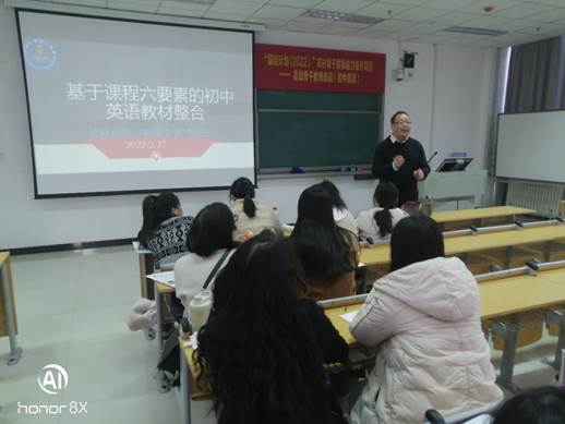 2023年2月27日上午,外国语学院邀请长垣市第一中学李朋云老师为参加“国培计划(2022)”县级骨干教师培训项目的初中英语老师作了以“基于课程六要素的初中英语教材整合”为主题的讲座。李朋云老师为中原名师、河南省教育教学专家以及人教版教材培训专家,2021年参加《义务教育课程标准(实验稿)》审定工作,连续多年参加《解析与检测》编写与审定工作。
