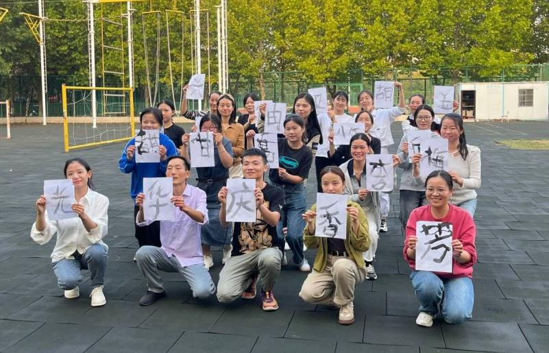 在体育学院刘振坤教练的带领下,学员们首先进行了简单有趣的热身活动。接着,通过自行建组,两队学员要在30分钟内完成队名、口号、队旗、队歌以及队操的展示,学员们通过精诚合作,出色地完成了任务。接下来的两个项目将素质拓展活动推向高潮,两队学员要在70分钟内完成“拉鼓颠球”和“大笔写字”两项任务的考核。其中,拉鼓颠球必须在全员配合下连续颠球不少于40次,大笔写字则需选用组员的姓字或名字创作一首五言绝句,并用大笔写在纸上。虽然双方在练习过程中困难重重,但大家并未轻言放弃。最终两队学员齐心协力,迎难而上,顺利地通过了终极考核。